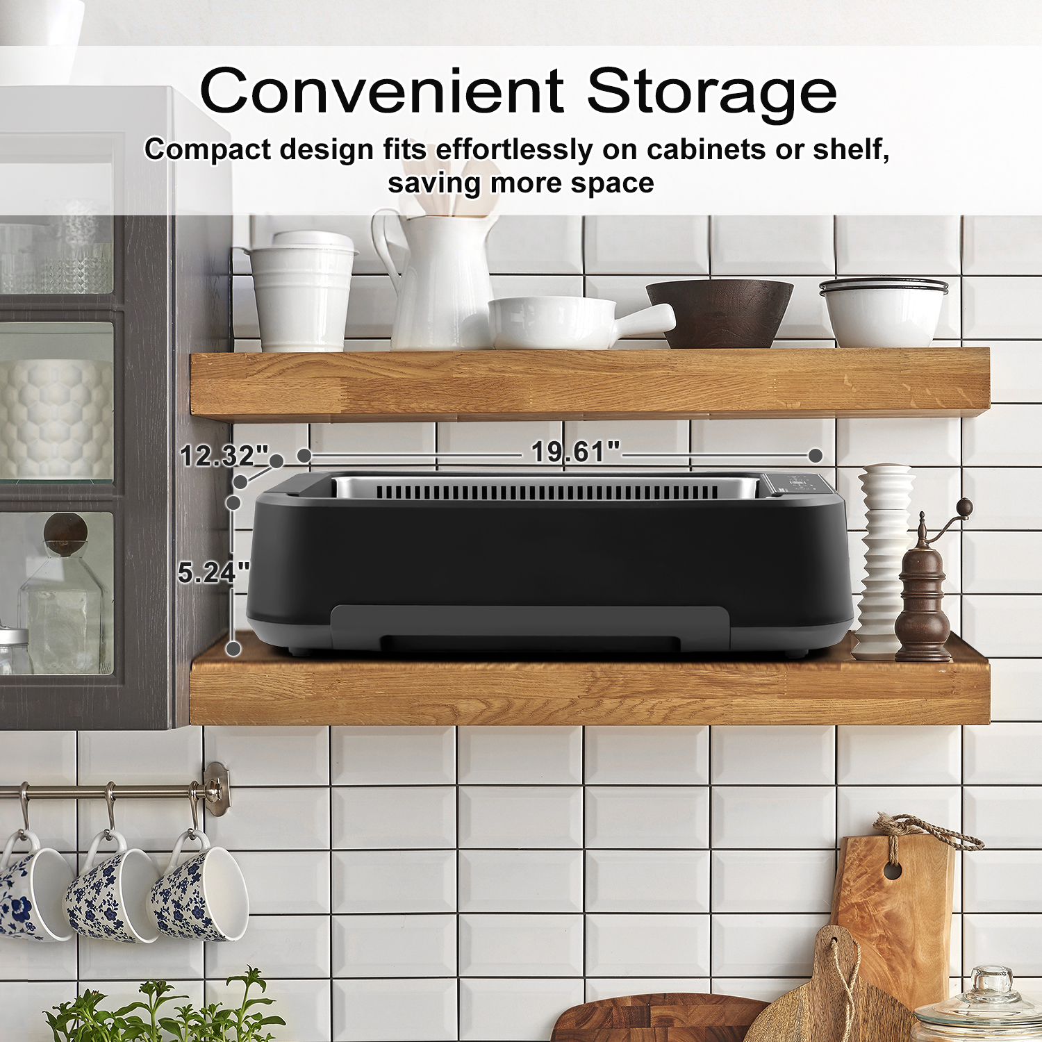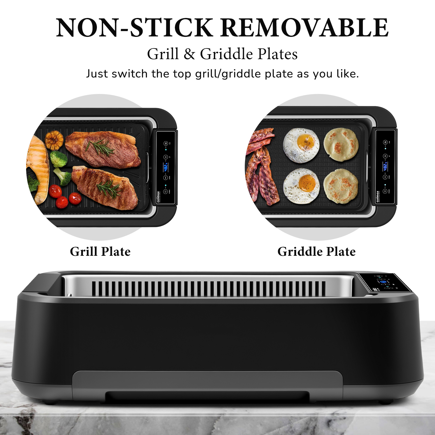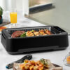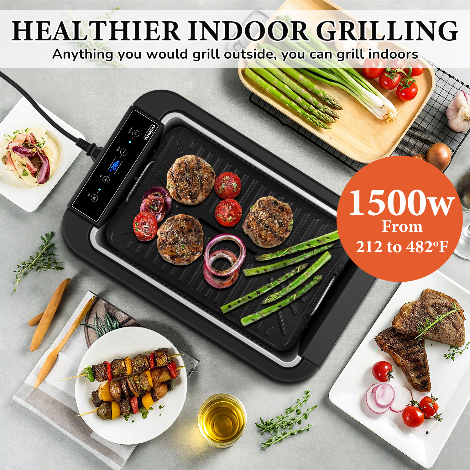 No need to be affected by outdoor weather, Electric grill is suitable for any indoor barbecue, including barbecue in small spaces such as city apartments, providing you with different barbecue modes. The grill is equipped with a turbo smoke extractor, it can reduce smoke by 95% when grilling, allowing you to enjoy grilling without being bothered by smoke.