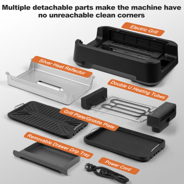 The double U heating tube can provide fast and continuous heating of food. Locks in the flavor and moisture of your food, giving you juicy steaks. A perforated grill pan filters out excess oil and leaves food with grill marks like a charcoal grill.