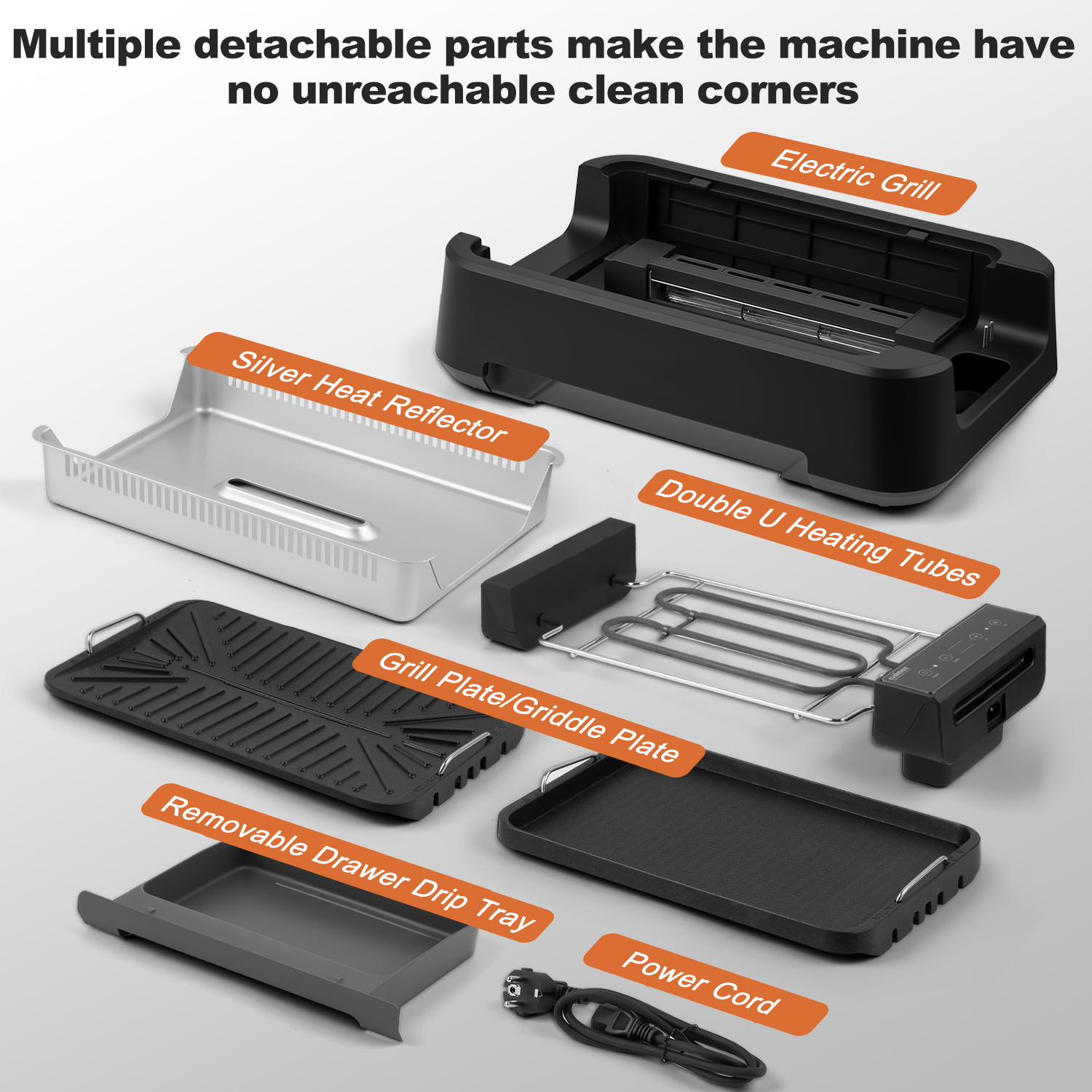 The non-stick grill plate makes it easy to take out food, and the multiple removable parts allow the machine to clean no corners that cannot be reached, making cleaning very simple! Dishwasher safe parts: glass lid/perforated heating plates/silver heat reflector/removable drawer drip tray.