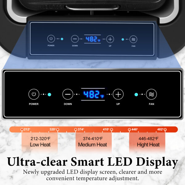 The grill has an adjustable temperature range of 212°F~446°F (212°F-248°F-320°F-374°F-410°F-446°F). The clear LED smart display can help you adjust the temperature very well.