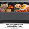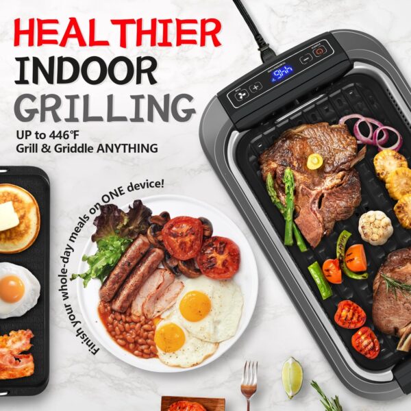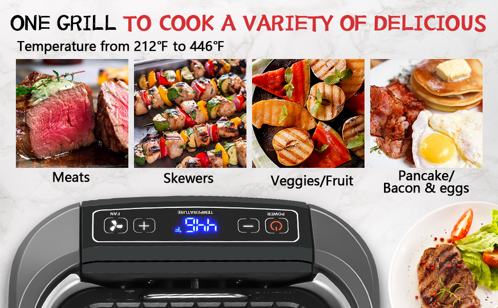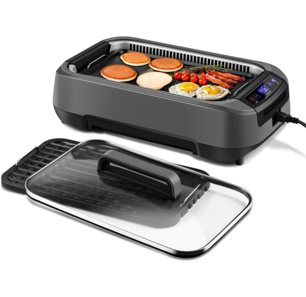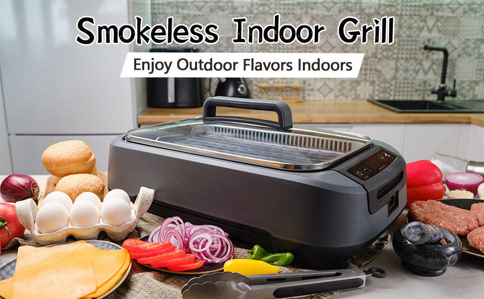 Upgraded Electric Indoor GrillThe newly upgraded smokeless grill provides an exceptional indoor grilling experience. The Turbo Smoke Extractor reduces smoke by up to 95%, leaving you with only the delicious aroma of your food—no visible smoke, and no worries about triggering smoke alarms or filling your condo with BBQ smells.