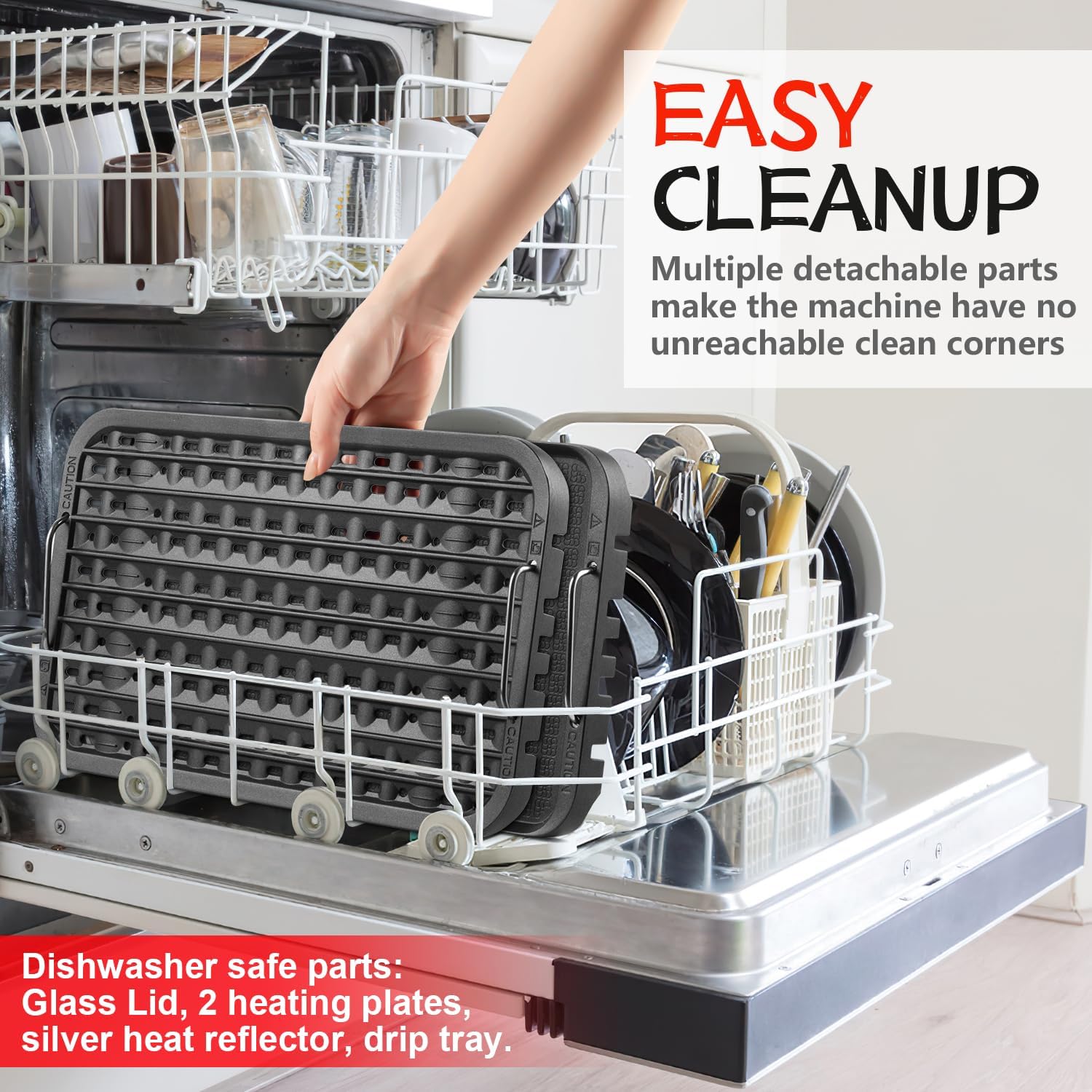 The grill is made of stainless steel and is easy to clean. The electric grill has removable parts and the glass lid, perforated bakeware and silver heat reflector are dishwasher safe.